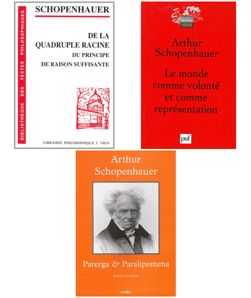 [1] Schopenhauer, De la quadruple racine du principe de la raison suffisante, 1813, Vrin © 1997. [2] Il s'agit d'une version persane des Upanishads traduites en latin par Abraham Hyacinthe Anquetil-Duperron : Oupnekhat, id est secretum tegendum, 2 vol., 1801. [3] Schopenhauer, Le monde comme volonté et représentation, 1819, PUF © 1966 (Tr. A. Burdeau), p. 350-351. [6] Schopenhauer, Parerga & Paralipomena, 1851, Coda © 2005, p. 645, 650-651. [7] Schopenhauer, Le monde comme volonté et représentation, 1819, PUF © 1966 (Tr. A. Burdeau), p. 393-397. [10] Schopenhauer, Parerga & Paralipomena, 1851, Coda © 2005, p. 343-345. [12] Schopenhauer, Le monde comme volonté et représentation, 1819, PUF © 1966 (Tr. A. Burdeau), p. 513-516.