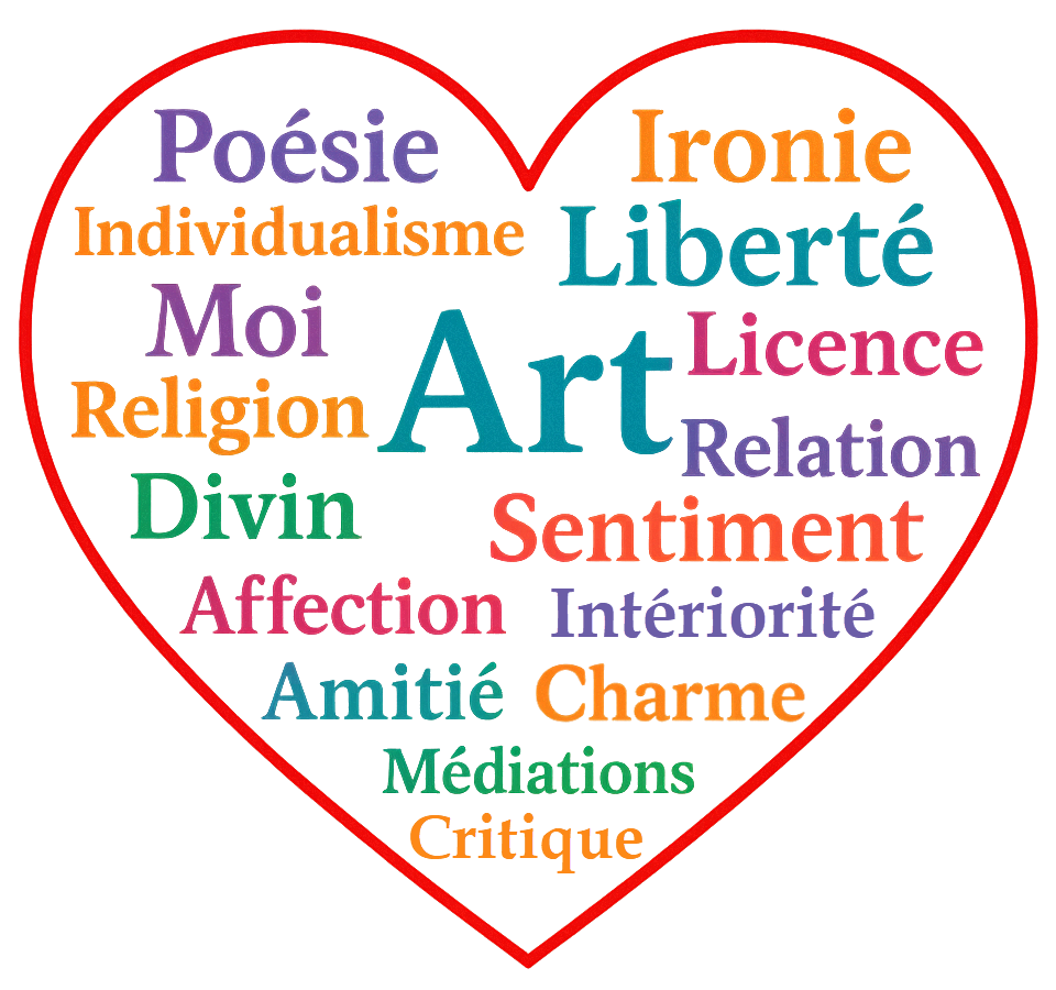 On ne compte plus les oeuvres littéraires qui en font l'apologie. Romans, cinéma, musique, vidéos, il est difficile de trouver une production médiatique qui ne prend pas pour fondement l'idéologie romantique. On la projette partout ; on la voit même adulée dans des vidéos où l'on montre des animaux sauvages, tels le tigre et le lion, comme d'inoffensifs toutous affectueux. On la retrouve jusqu'en politique, où elle fonde le texte de loi le plus reconnu qui soit : les Droits de l'homme. Bref, l'Europe du 18e siècle s'est prise d'une affection particulière pour la liberté, et Schlegel formule ce qu'il est convenu d'appeler le premier romantisme autour d'une cartographie émotionnelle comprenant dix-sept notions dont l'agencement illustre les nouvelles valeurs qui vont graduellement se répandre dans le monde entier : |