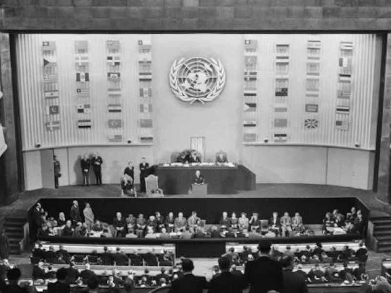 [1] Adoptée par 48 États à la 3e Assemblée générale de l'ONU, le 10 déc. 1948 à Paris, au palais de Chaillot. Sur les 58 membres, il y a eu 8 abstentions et 2 n'ont pas pris part au vote.